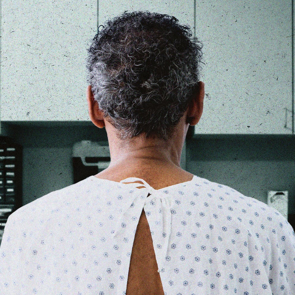 A man in a hospital gown sitting on a hospital bed.